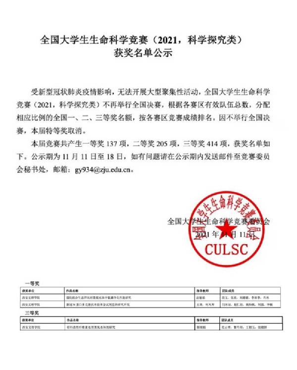 近日,全国大学生生命科学竞赛委员会公布了第五届全国大学生生命科学竞赛(2021,科学探究类)获奖名单,其中bat365bat365平台官网师生荣获全国一等奖2项(陕西赛区一等奖共7项)、三等奖1项。