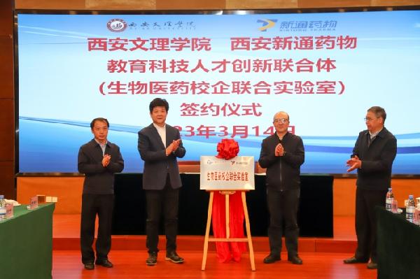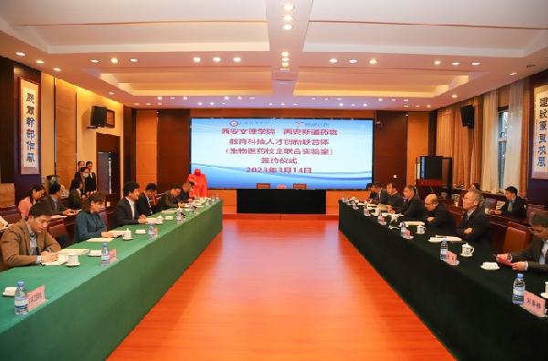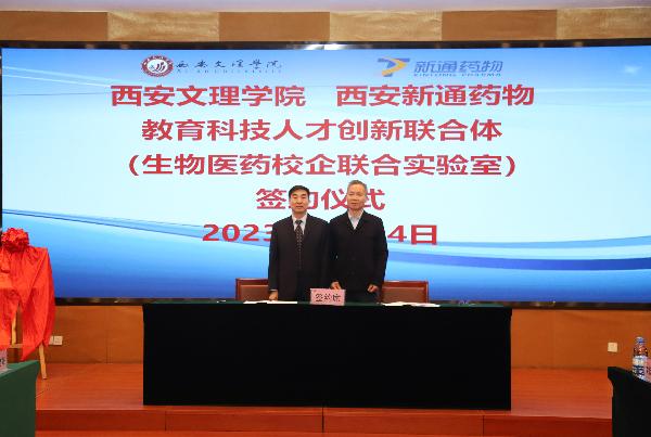 3月14日,bat365平台官网和西安新通药物共建教育科技人才创新联合体(生物医药校企联合实验室)签约仪式在bat365办公楼举行。省教育厅科技处处长朱晓冬,市科技局一级调研员张化化,高新区科技创新局(秦创原创新驱动发展办公室)局长(主任) 邓巍,高新区创业园发展中心主任杨戎,西安联创孵化器有限公司总经理刘海鹏,西安新通药物研究股份有限公司董事长兼总经理张登科,bat365党委委员、副校长刘明利,学校相关部门、学院负责人以及bat365平台官网班子成员参加,党委委员、科研处处长鲍锋主持仪式。