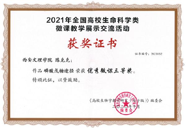 近日,2021年全国高校生命科学类微课教学展示交流活动(原全国高校生命科学类微课教学比赛)评选结果揭晓,bat365bat365平台官网副教授陈克克的作品--《磷酸戊糖途径》荣获全国三等奖。据悉,此次全国微课教学比赛共有来自30个省(市、自治区)的100余所高校的300余位生命科学类课程(本科)专任教师参赛。