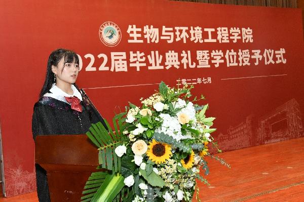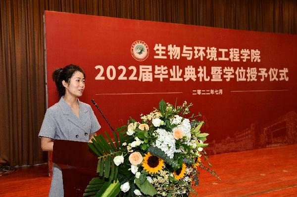 接着,师生代表王波、刘佩云,校友代表权佳馨,毕业学生家长代表马电蒙分别发言。刘佩云同学饱含深情地回忆了镜湖的晚霞、披星戴月的考研生活,通过在校生活的点点滴滴表达了对母校的不舍之情。王波老师分享“毕业是终点,也是新起点”的感悟,鼓励同学们积极面对新的生活与工作,坚持做正确的事,树立终身学习观,迎接美好的明天。